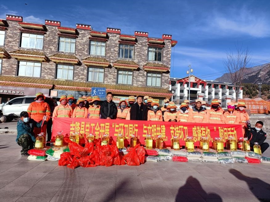 123日,吉隆縣總工會在吉隆鎮(zhèn)廣場組織開展了“與環(huán)衛(wèi)同行、與文明共建、支持環(huán)衛(wèi)、感謝有你”慰問一線環(huán)衛(wèi)工人活動。吉隆縣環(huán)衛(wèi)項目部負責人積極協(xié)助縣總工會,認真組織環(huán)衛(wèi)工人,讓大家有序地領(lǐng)取大米、菜油、羊頭等慰問物品。